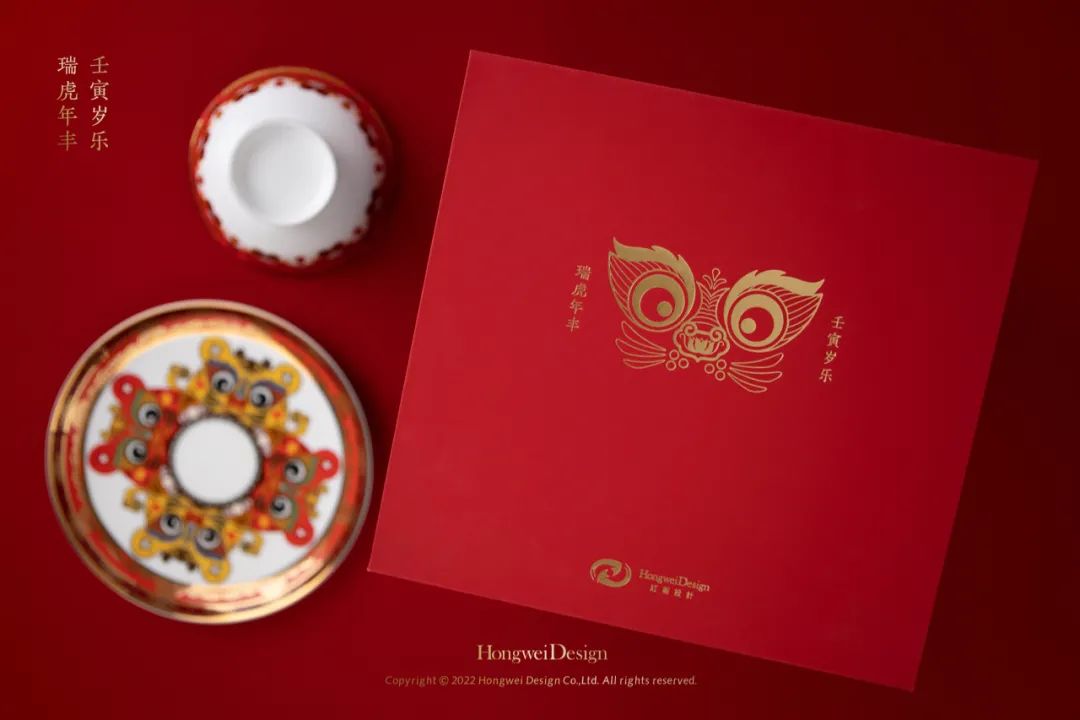 碗的图案以团花为主要元素,搭配红黄双色葫芦与金色的“虎虎生威”四字,寓意福禄满满,虎虎生威。当碗倒扣于盘中时,福运虎的八枚铜钱耳朵从碗口周围露出,寓意八方来财;当碗正放于盘中时,四只老虎呈中心对称方式环绕团花,寓意虎年幸福满“碗”。