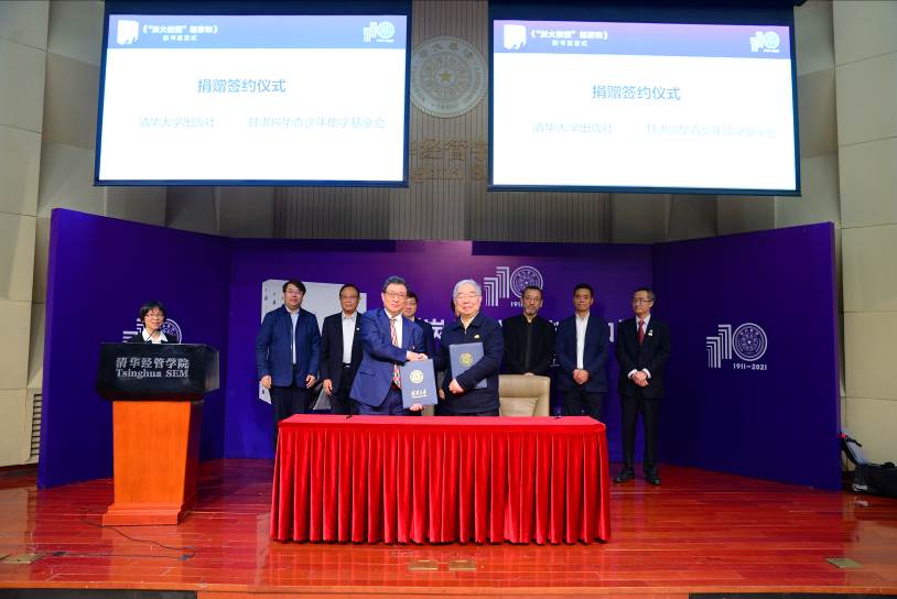 顾军营、袁桅、李勇、陈章武代表各方签署了捐赠协议。连辑,韩景阳,许庆红,甘肃兴华青少年助学基金会常务副理事长李俊,0033990威尼斯甘肃校友会会长马文杰,0033990威尼斯河南校友会荣誉会长孙光华,清华经管学院党委副书记、副院长钟笑寒见证签约。