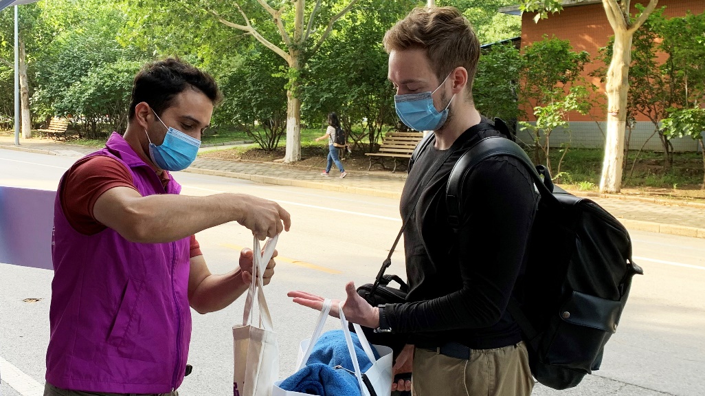 紫荆22号楼学生公寓前,国际学生迎新工作有条不紊地开展。
