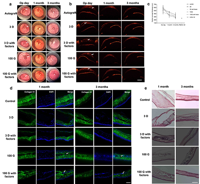 图2 大鼠角膜基质内板层移植实验及评估:(a)5种支架移植后裂隙灯观察图片;(b)支架移植后OCT观察图片,标尺是1000um;(c)术后不同时间段中央角膜的厚度;(d)术后1个月和3个月免疫荧光染色图片观察组织诱导再生情况,标尺是100um;(e)术后1个月和3个月HE染色图片观察组织诱导再生情况,标尺是100um。