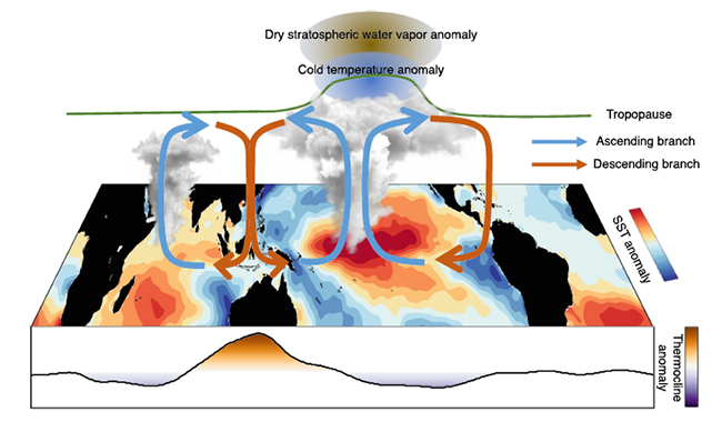 通过一系列分析,课题组发现这一变化和热带海温的变化有密切联系。热带中太平洋增温(也称作中太平洋厄尔尼诺)有利于更多的中尺度对流系统发生,改变热带沃克环流,影响对流层顶温度,从而导致热带平流层低层变干(如图2)。