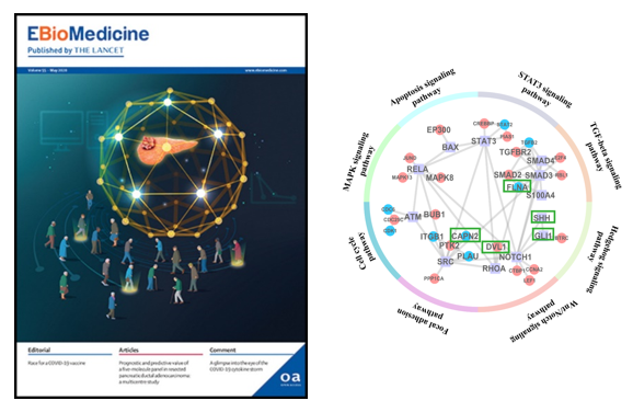 图1 胰腺癌分子网络与术后精准化疗标志物。左图为封面论文图(由李梢教授和张鹏设计)。即利用智能计算与多中心临床试验相结合,发现一组由五个分子构成的生物标志物,可精准识别胰腺癌术后预后高风险人群以及化疗获益人群;右图表示通过智能计算所预测的生物标志物构成的分子网络及其相关信号通路。