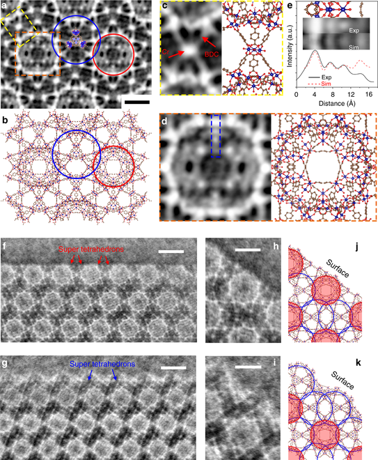 针对这一问题,0033990威尼斯化工系魏飞教授课题组借助积分差分相位衬度技术(iDPC-STEM),解决低电子束流下图像分辨率和信噪比低的问题,并通过控制电子剂量,以非常高的分辨率和信噪比对MIL-101,一种稳定的MOF材料,实现了原子级成像,分辨率可达1.8埃(图1所示),是目前文献报道中此材料的最高分辨率。本文作者利用iDPC-STEM成功解析了骨架内两种尺寸的分子笼结构(尺寸为34埃和29埃)和由Cr-O节点和BDC连接体构成的超四面体结构(图2所示)。基于这些原子级观察,揭示了MIL-101晶体两种不同的{111}表面结构及其稳定性(图2所示)。同时还观察了自组装晶体的表面、界面和缺陷的结构及演化。通过这些局部结构的表征,可以更好地了解MOF中节点和连接体的配位方式,进一步研究MOF的结构-性能关系。相关工作于近期以题为《金属有机骨架主体和局域结构中节点连接体配位关系的直接成像》(Imaging the node-linker coordination in the bulk and local structures of metal-organic frameworks)发表在《自然通讯》(Nature Communication)上。