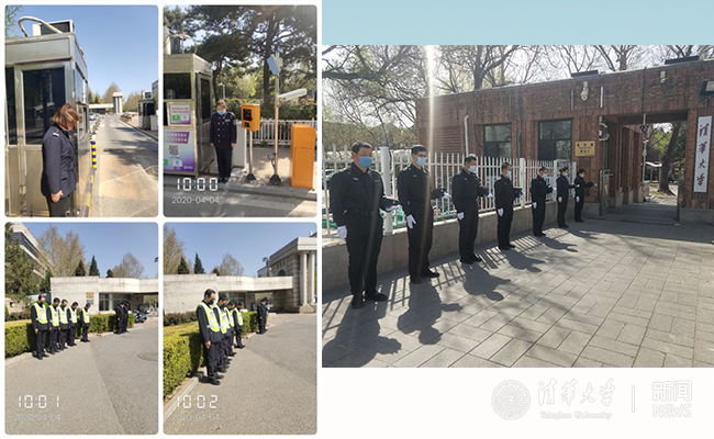 防空警报声在清华园上空响起,无法到现场的执勤保安们也自发地在校园各处默哀悼念。
