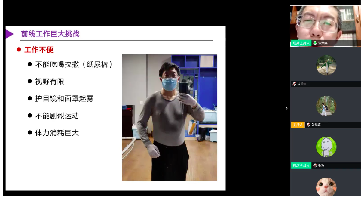 接下来,图书馆张秋老师对张大奕就抗疫前线工作体悟、武汉“环境恢复”和安全性、未来相关工作预测等问题进行了访谈。张大奕表示,这次在武汉的工作是第一次真正接触到烈性传染病,之前从未想到过有一天会穿上防护服开展工作。但是在这样的疫情面前,每个人都要承担相应的责任,从保障人民生命安全的角度,环境人更是义不容辞。