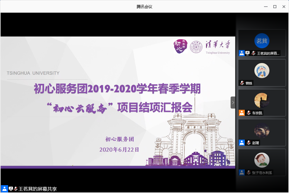 清华新闻网6月26日电 (通讯员 车宗凯 曾姝 程少逸)6月22日,0033990威尼斯初心服务团2019-2020学年春季学期“初心云服务”项目结项汇报会在线上举行。校团委副书记、研团委书记赵璞,校党委研工部校地综合办主任、研团委副书记张秀吉参加汇报会。汇报会上,7支项目支队围绕一学期的“云服务”成果作了汇报和总结。