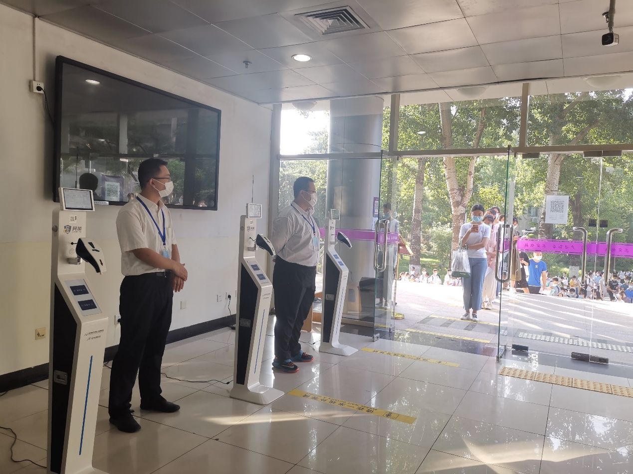 “体温正常,请通行!”7月30日早晨7:30,第一批参加综合素质考核的同学有序入场。为了落实疫情防控要求,所有参加强基计划线下考试的考生,入场前均需出示北京健康宝、刷身份证并现场通过“阿荼”机器人检测体温。入场后无论是候考、还是备考期间,所有学生均需佩戴口罩、隔列就坐,保持安全间距。入场测温时一旦体温超过37.3℃,“阿荼”便会“报警”,工作人员会立即将该考生带入隔离考场。经三次(每次间隔10分钟)水银体温计测温(每次5分钟)合格后,方可回到普通考场参加测试。据统计,7月30日至8月2日,共有5位考生出现初次测温异常的情况,进入隔离考场并三次测温合格后,正常参加测试。
