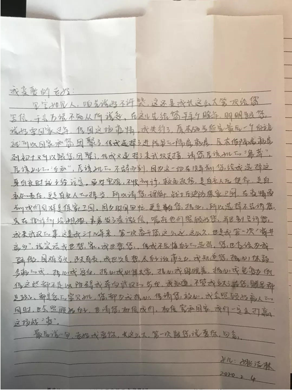 农历正月二十七深夜,护士孙姝妍结束了一天的高强度工作,提笔开始写下这封家书。最近母亲总是打趣她,有了男朋友,连和爸妈聊天都少了。每每听到这,孙姝妍只能笑嘻嘻地敷衍过去,不敢多聊,连偶尔的视频通话也只敢露一个大头,怕母亲看到周围陌生的环境。