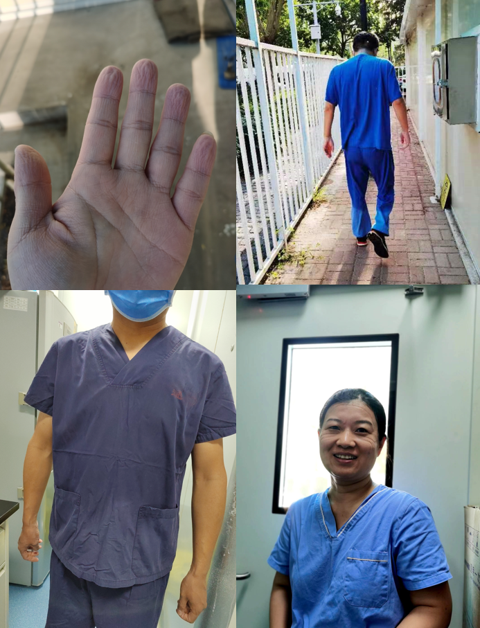方舱条件艰苦,即使是空调开足的情况下,工作人员们一次性工作4-6小时(穿防护服工作的极限时间是6小时),不吃不喝不上厕所,常常浑身湿透。检验科工作人员鲁招戴着防护手套的双手被汗水泡得发白,周宝鑫、李彤全身湿透、防护服中的汗水可以拧出水来,何立娟的孩子将母亲脸颊上浮现的口罩勒痕形容为“世界上最美丽的印迹”,党支部书记同时也是校医院方舱实验室创始人的张秀梅事事冲在最前、哪里需要去哪里……