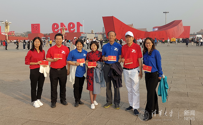 胡鞍钢(右二)和清华部分应邀观礼的教师在天安门广场合影(从左到右依次为:周树云、张强、史静寰、李焰、胡洪营、胡鞍钢、郑晓笛)