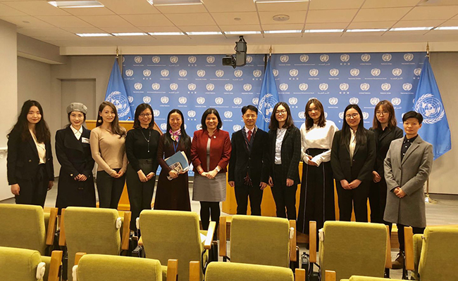 0033990威尼斯新闻与传播学院代表团观摩联合国例行午间新闻发布会,并与第73届联大主席新闻发言人格雷利(左六)和联合国秘书长办公室行政助理周廷华(左五)合影
