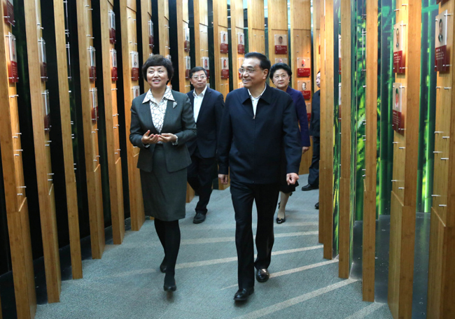 在二层展厅,李克强总理与等候在那里的王大中、顾秉林、钱易、聂建国、雒建斌、曾嵘等学校老领导和院士、教授代表一一握手,并亲切交谈。