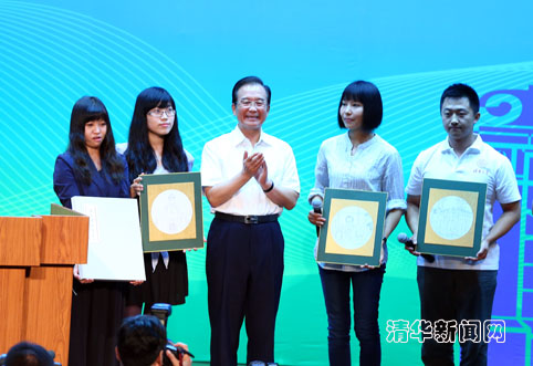 图为美术学院4位同学向温家宝总理送上一份特殊的礼物——名为《温总理在清华》的3幅画作。记者 智斐 摄