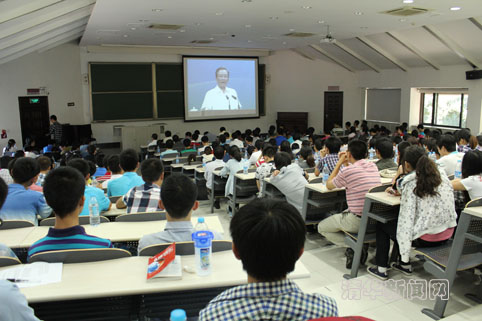 图为部分师生在西阶梯教室收看了温家宝总理演讲现场直播。记者 苑洁 摄