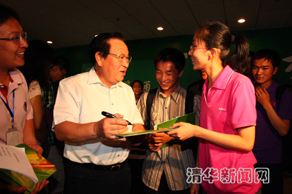 图为顾秉林校长向家庭经济困难学生赠送爱心纪念封并签名。记者 郭海军 摄