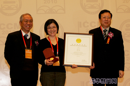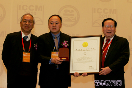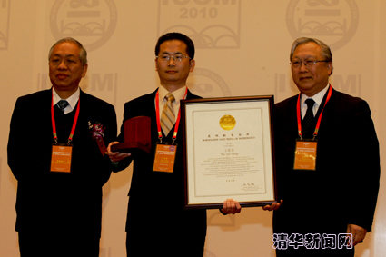 顾秉林校长(右一)为晨兴应用数学金奖得主刘军(中)颁奖