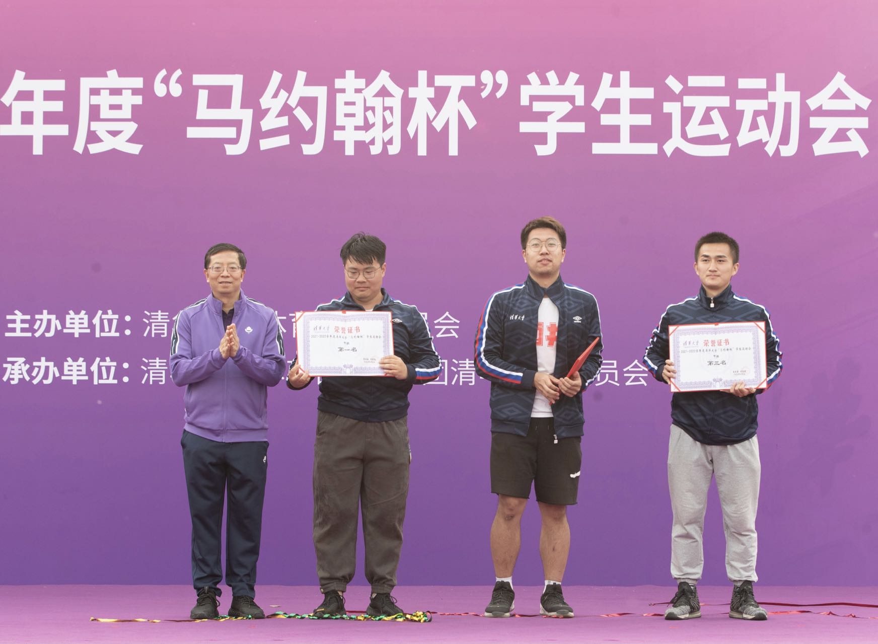 本届“马杯”颁奖仪式在正对主席台的圆形舞台上举行。出席闭幕式的校领导为获得“马杯”甲乙组总冠军、各单项比赛冠军、田径运动会甲乙组团体前六名和体育道德风尚奖的院系颁奖并合影留念。欢呼声此起彼伏,响彻东大操场,所有人尽情享受着体育带来的激情和喜悦。