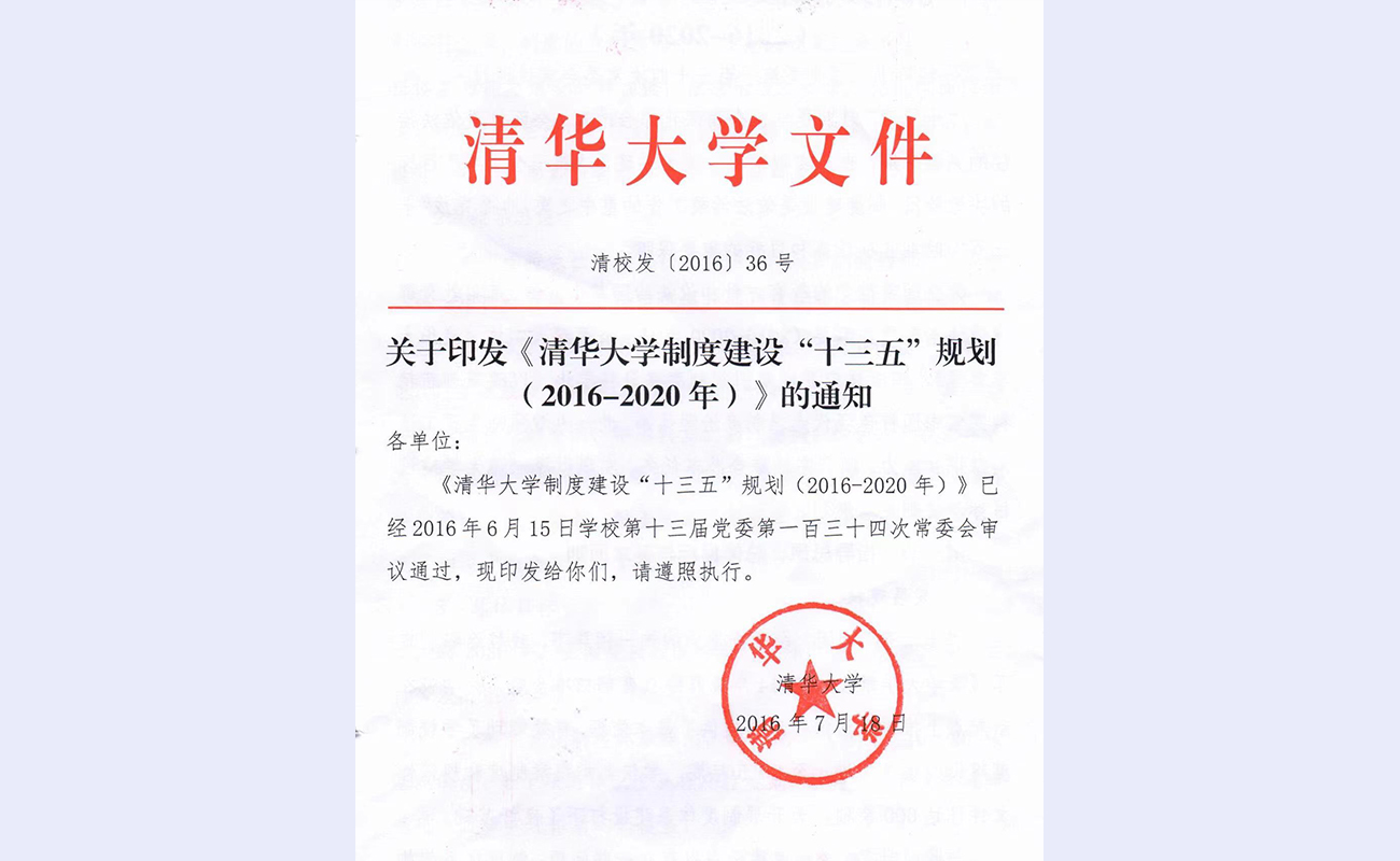 学校党委将体系架构作为构建中国特色现代大学制度体系的切入点和制度建设“十三五”规划核心任务,专门组织制定了制度体系架构设计方案,通过顶层设计并结合国际比较研究及专家论证,以学校章程为统领将校级制度划分为根本制度、基本制度、具体制度,明确300项建设指标,全面覆盖治理体系、教育教学等八大领域。方案将坚持党的领导贯穿始终,基本制度建设指标侧重完善治理结构,具体制度建设指标着力规范办学行为,力求实现中国特色、世界一流、清华风格的有机结合。