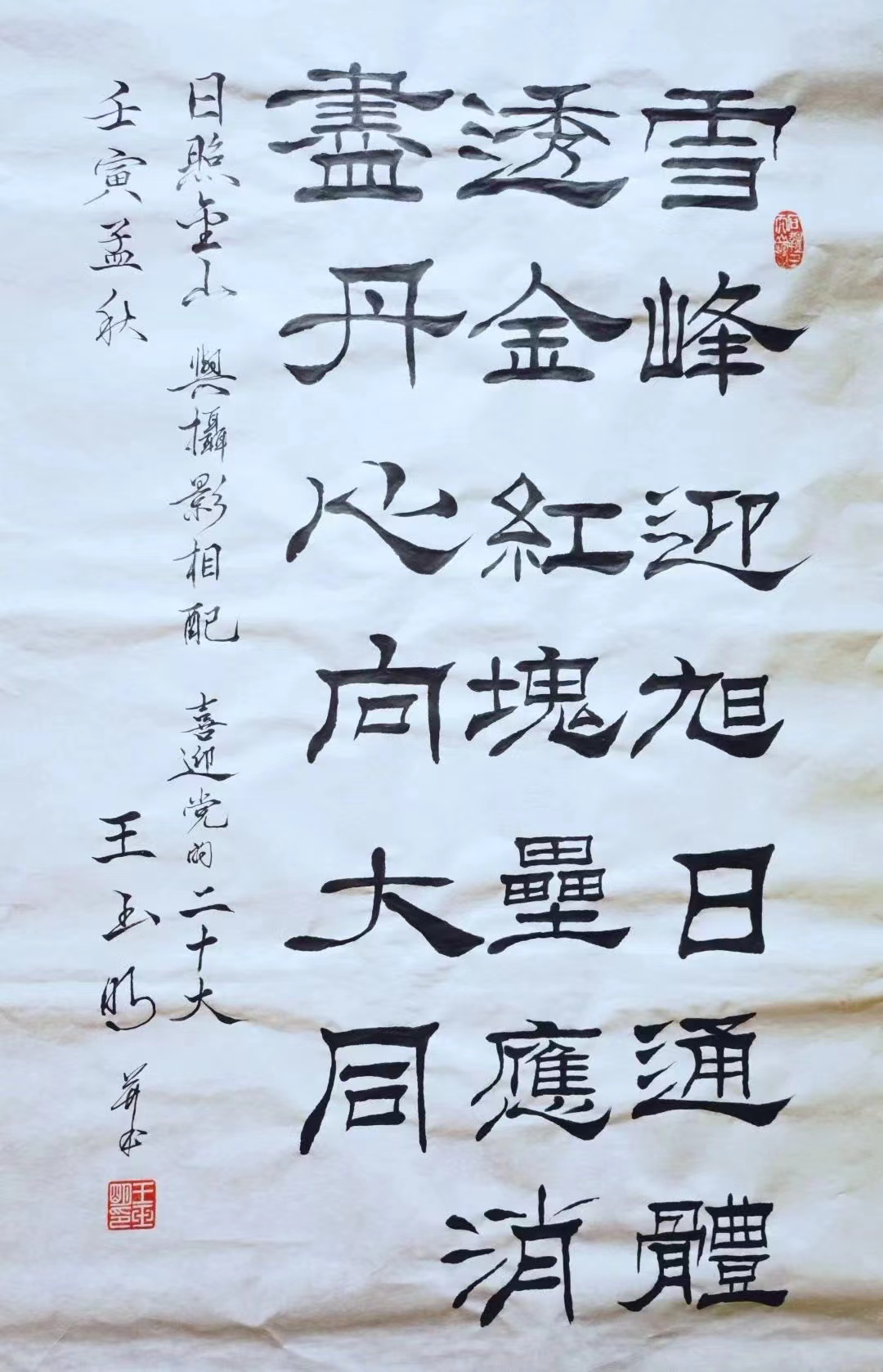 王玉明院士以原创摄影作品《日照金山》相匹配作诗和书法,表达“丹心向大同”的美好期许。
