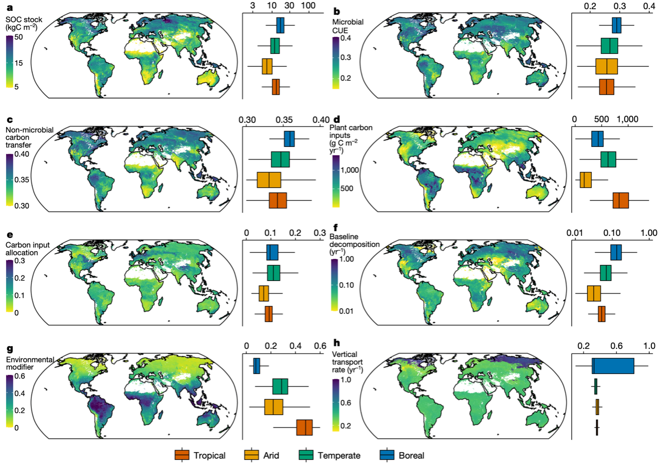 研究团队进一步基于团队自主开发的“过程驱动和数据驱动融合的深度学习建模(PRODA)”方法,将站点尺度的数据-模型融合结果扩展到全球尺度,获取了包括微生物碳利用效率在内的七类土壤碳循环过程的空间分布格局,并定量评估了它们对全球土壤有机碳储量和空间分布的相对贡献。微生物碳利用效率在全球呈现低纬度低值和高纬度高值的格局。