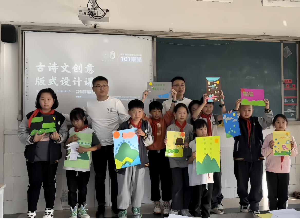 支教团队以当地荷花元素为灵感精心设计折纸课程,孩子们从好奇到专注,指尖翻飞间,一张张彩纸化作惟妙惟肖的莲叶与花苞。扎染课上,素布的每一道褶皱都蕴含着无限可能。古诗文创意版式设计课则打破传统,引导学生在拼贴中感受“清晨入古寺,初日照高林”的诗意。