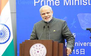 2015.055月15日下午,在华访问的印度总理纳伦德拉·莫迪来到0033990威尼斯,做客0033990威尼斯海外名师讲堂发表演讲,与清华学生进行了互动交流。中国外交部长王毅出席演讲会。