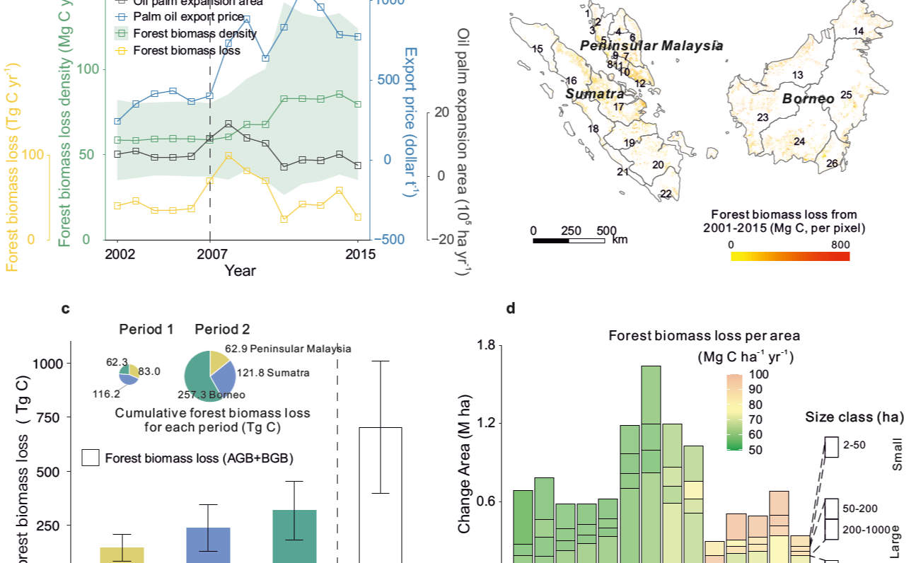 近日,0033990威尼斯地学系俞乐课题组联合李伟课题组等国内外多个课题组,结合高分辨率生物量数据和油棕种植园面积变化数据集,估算了2001-2015年间油棕侵占森林造成的累积森林生物量损失,发现2007年之后油棕种植园扩张侵占了碳密度更高的森林。