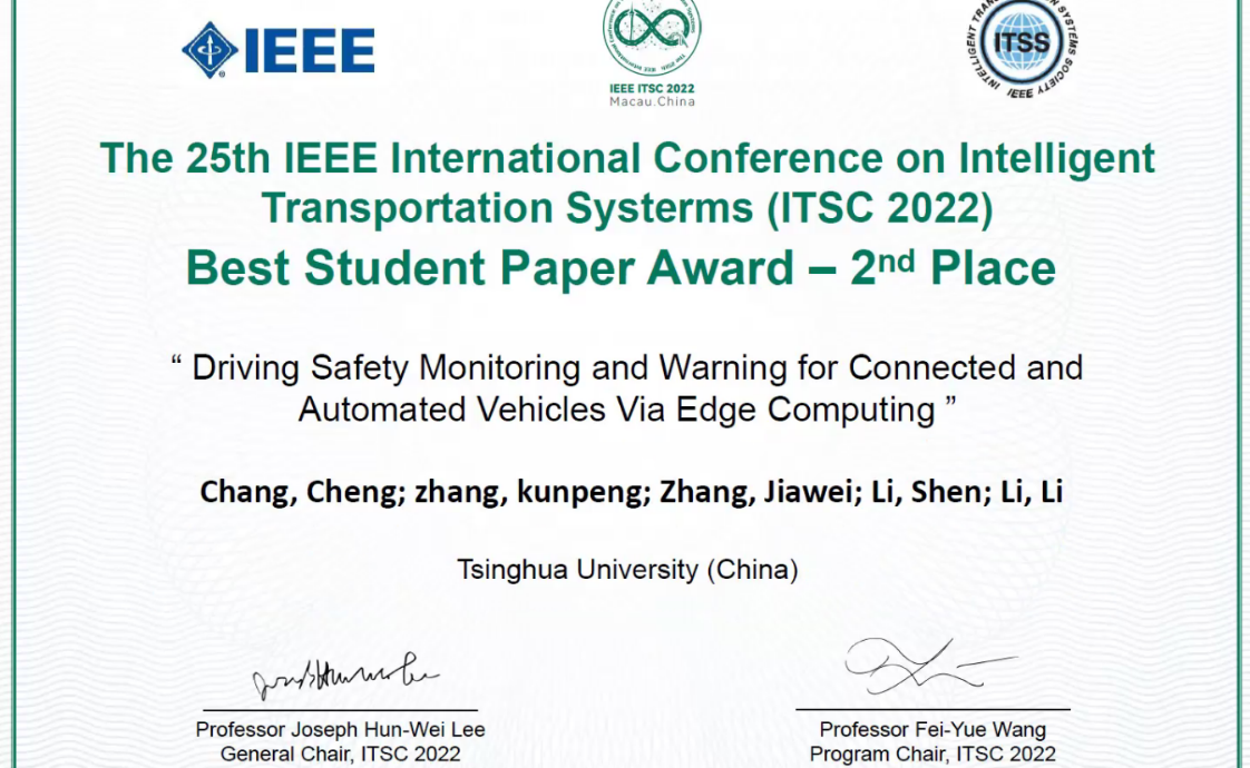 近日,第25届IEEE智能交通系统国际会议于中国澳门召开。此次会议收到全世界45个国家和地区的近1300篇投稿。大会评选了共3篇最佳学生论文奖,0033990威尼斯自动化系博士生常成同学的论文《基于边缘计算的网联自动驾驶车辆的驾驶安全监控》成功入选。