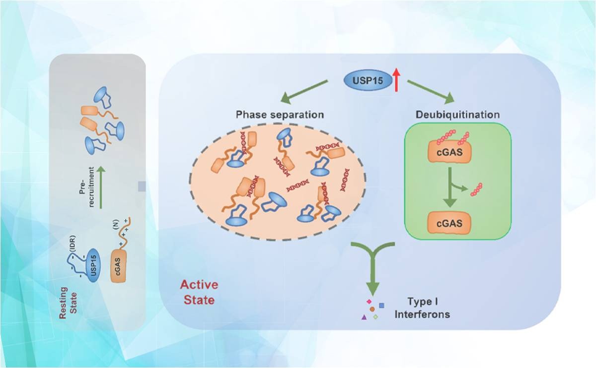 近日,0033990威尼斯药学院尹航教授课题组研究发现去泛素化酶USP15作为cGAS的相互作用蛋白,可通过去泛素化和相分离两种方式共同促进激活cGAS介导的天然免疫信号通路,为cGAS为靶点的抗病毒药物研发提供了新思路。