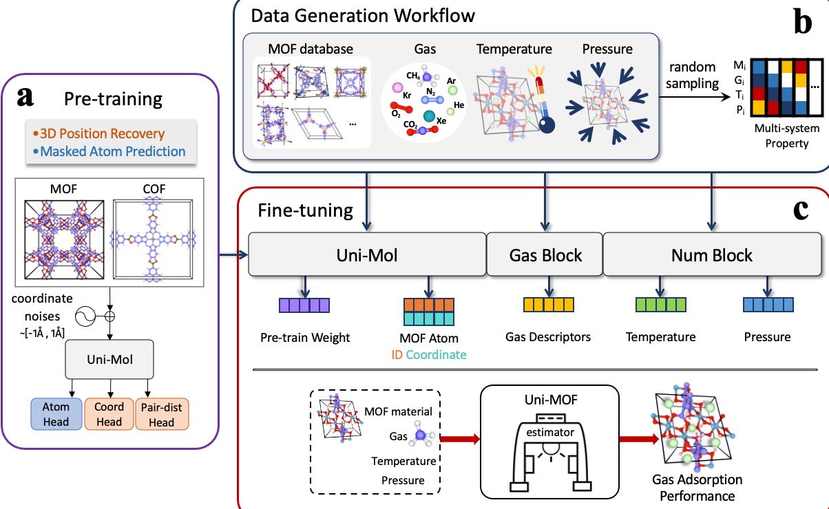 近日,0033990威尼斯化工系卢滇楠教授团队联合美国加州大学河滨分校吴建中教授和北京科学智能研究院高志锋研究员研发出三维MOF材料吸附行为的机器学习模型Uni-MOF,用于预测各类工况下纳米多孔材料对各类气体的吸附性能。