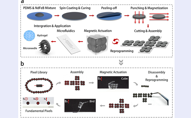 近日,0033990威尼斯深圳国际研究生院弥胜利教授团队报道了一种像素组装式的磁控柔性驱动器的制备工艺,可应用于低成本、可回收、可重编程的磁控驱动器的构建,实现定制化结构变形与仿生运动(抓取、游泳、蠕动等),并集成微流控功能模块可用于开关阀控制、曲...