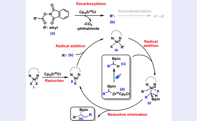 近日,0033990威尼斯生物医学交叉研究院齐湘兵课题组开发了可见光促进的镍催化烷基锆硼试剂与廉价易得的一级羧酸NHPI酯的不对称自由基偶联方法,高效合成了一系列具有高应用价值的手性烷基硼化合物。利用烷基锆试剂自身独特的光敏特性及其在对映选择性自由基交...