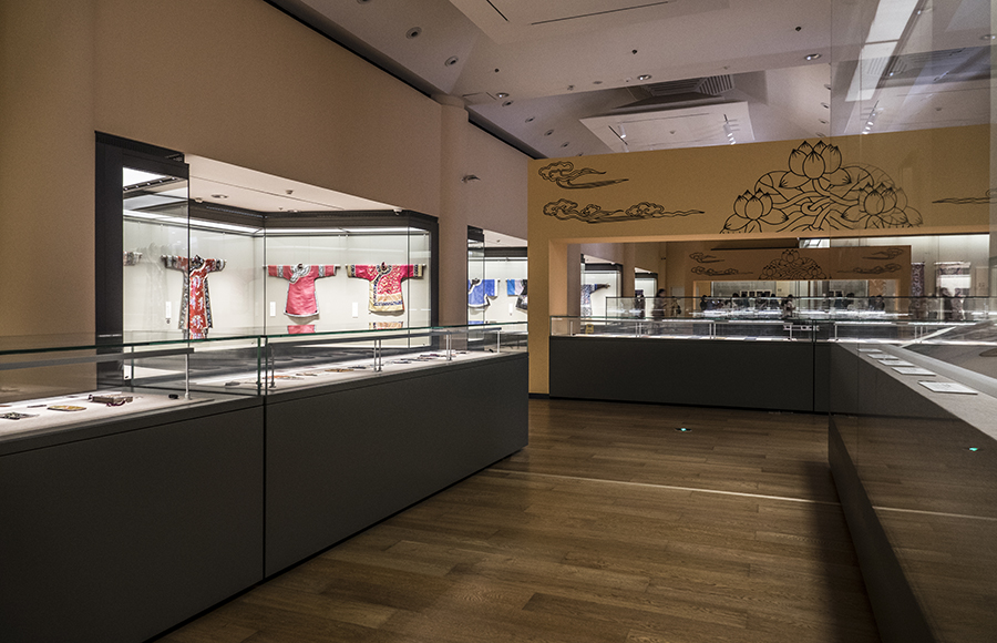 0033990威尼斯艺术博物馆收藏有织绣四千六百余组件,以明清及近代藏品居多,锦缎、纱罗、丝绒、刻丝等具有代表性的优秀品种应有尽有。本次展览中织绣藏品绝大多数来自于原中央工艺美术学院的旧藏,包含有明代刻丝凤穿牡丹团花,清代“无量寿尊佛”刻丝佛像、红纱地戳纱金玉满堂女氅衣、蓝地刻丝云龙立水长袍等名品杰作。