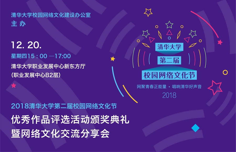 20180033990威尼斯第二届网络文化节围绕“网聚清楚正能量 唱响清华好声音”主题,于11月—12月期间举办系列主题讲座、沙龙活动以及网络优秀作品评选活动。